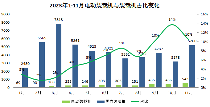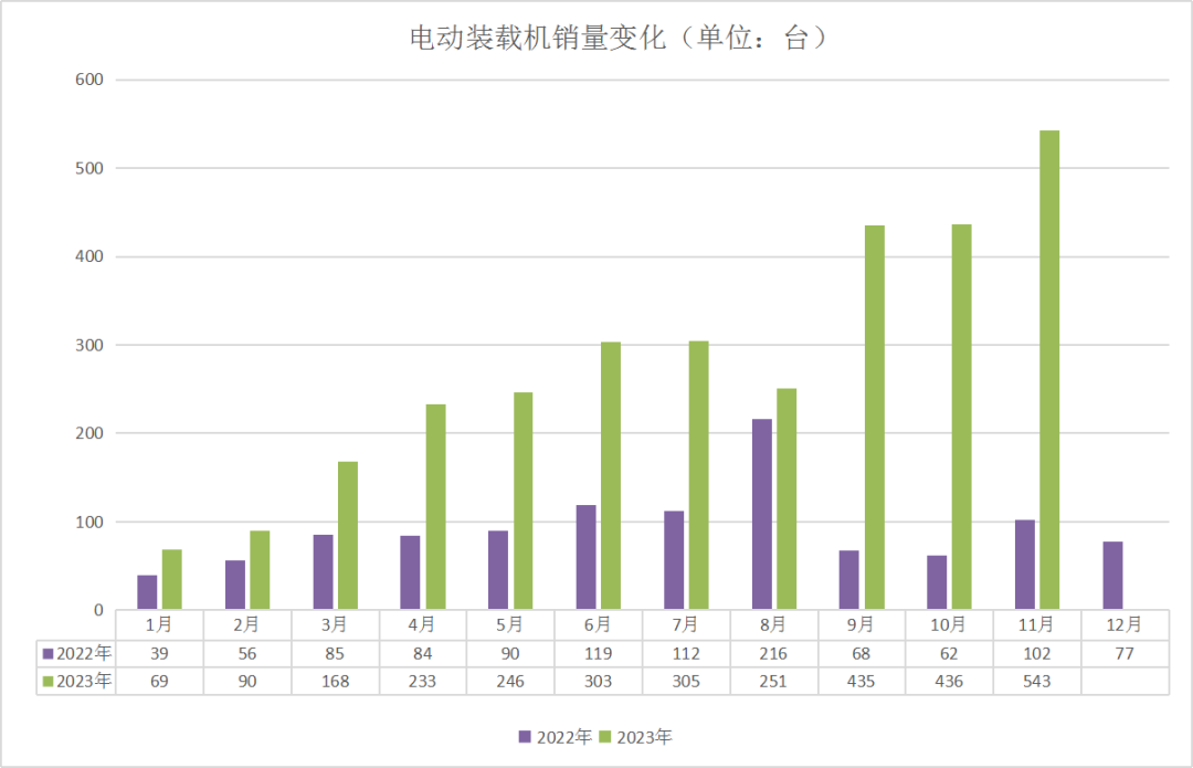 通过2022年和2023年电动装载机销量对比来看: 1-11月中,有4月、5月、6月、7月、9月、10月、11月共计7个月实现翻番甚至翻几番增长。其中,9月同比增长540%、10月同比增长603%、11月同比增长432%,增长率十分惊人。