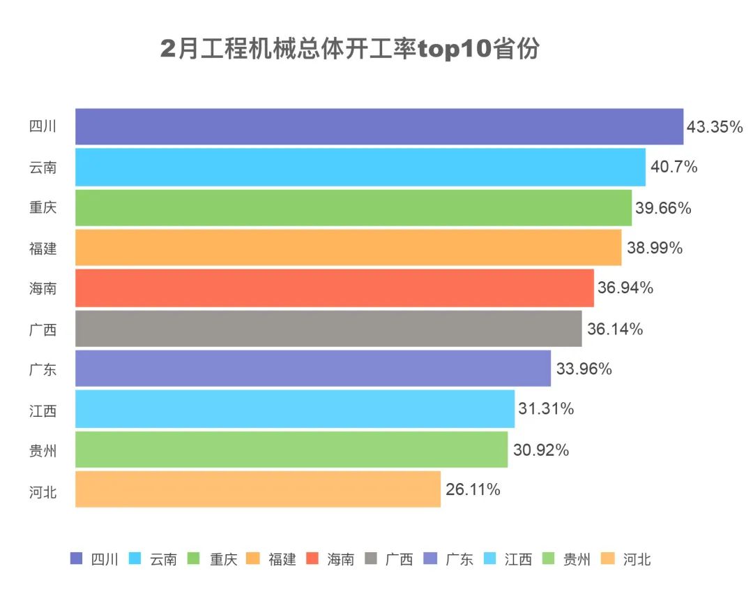 2月,受天气影响,开工率前列省份主要分布在南方。四川、云南、重庆、福建、海南为全国开工率top5省份。其中,自2023年3月起,海南开工率一直排在全国前五。