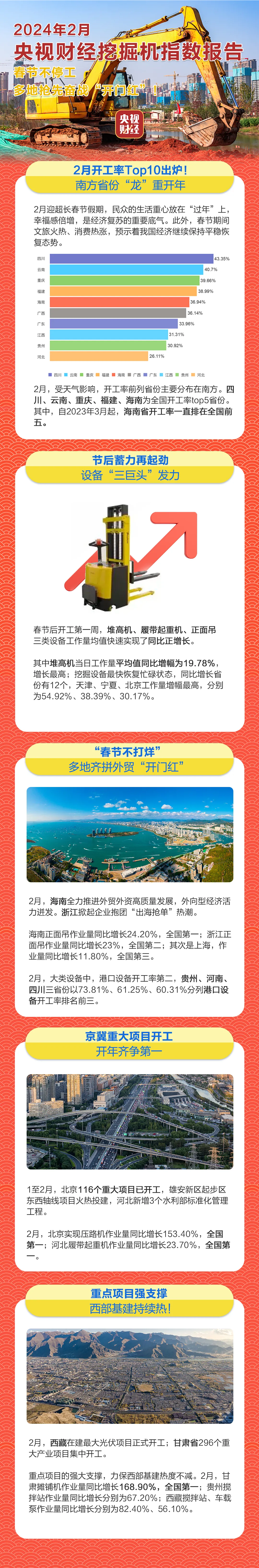 挖掘机是基础设施建设的“标配”,是反映基础设施建设、观察固定资产投资等经济变化的风向标。央视财经打造的“央视财经挖掘机指数”今天发布了最新相关数据。春节前后多地重大项目不停工,抢先奋战“开门红”。