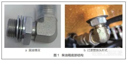 某型挖掘机柴油箱完成装配后加注柴油时,发现地面上出现大量柴油油迹,这说明该柴油箱有泄漏现象。经仔细检查后发现泄漏部位在柴油箱底部通往柴油机油管的直角过渡管接头处,如图 1a 所示。