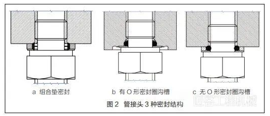 该种可调向端螺母密封式直角过渡管接头为我公司首次用于柴油箱油管的过渡管接头,正在对样机进行试制,在安装过渡管接头时,取消了原有的 O 形密封圈及挡圈,使用组合密封垫进行密封后,过渡管接头出现漏油故障,由此断定密封方式有问题。组合垫密封如图2a 所示。