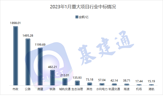 据基建通大数据统计,2023年1月基建重大项目中标约 314 项,总金额约 5667 亿,同比增长 36.3%。其中,市政大项目中标金额最高,约 74 个上亿项目,总计 1898 亿,公路大项目数量最多,约 89 个项目项目,总计1495亿。