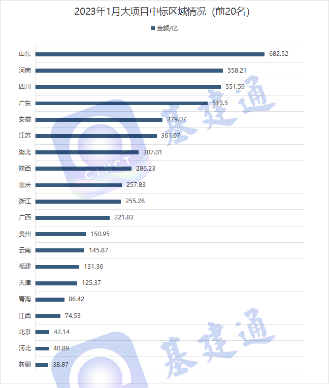 从1月大项目所处省份来看:山东省约 47 个重大项目公布中标人,金额达682亿,为第一;其次是河南、山东、四川等地。